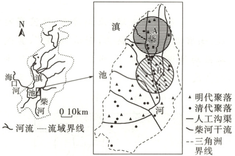 下面左图为滇池流域示意图。海口河为滇池湖水的唯一出口,元代以来多次疏浚。明代,滇池南岸有大量移民迁入,水稻种植面积逐渐增加。清代,人们在柴河下游相继开挖了十余条沟渠。明清时期,柴河三角洲面积显著扩大。下面右图示意明清时期柴河三角洲的聚落分布。