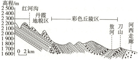 彩色丘陵(简称彩丘)是近几年才出现的地貌学名词,彩丘属于多种因素形成的丘陵状杂色岩石地貌,因其缤纷的色彩而被称为彩色丘陵。下图为祁连山中段北麓张掖丹霞地貌区和彩色丘陵地貌区地质剖面图。据此完成9~10题。