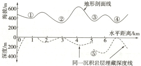 下图是某地地形剖面及其地下同一沉积岩层埋藏深度示意图。岩层的埋藏深度(岩层距离地面的垂直距离)可以用来帮助恢复岩层的形态。读图,回答12~13题。