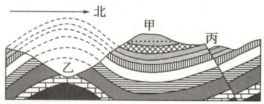 (1)题,由图中可以看出,甲处岩层向下凹,为向斜;乙处岩层向上凸,为背斜;丙处岩层断裂错动,为断层。第