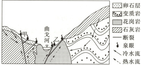 茶洛温泉群地处横断山脉北端金沙江支流曲戈河河谷地带,这里断层发育,河谷两岸汇聚众多温泉,但温泉水温差异较大。下图为曲戈河河谷地质剖面图。据此完成14~15题。