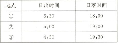 1. 下表为北半球三地的日出日落时间(北京时间)。读表,完成(1)~(2)题。