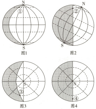 1. 各图所示日期中,①②③④四地中昼长相同的是 (