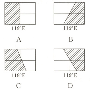 读下面四幅昼夜分布示意图(阴影部分表示夜),完成 1~2 题。