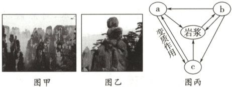 2. 受地质作用影响,湖南省张家界石英砂岩岩峰林立,安徽省黄山多球状“怪石”。图甲、图乙分别是摄影爱好者拍摄的张家界和黄山风光图片;图丙是三大类岩石及岩浆之间相互关系示意图,图中a、b、c表示三大类岩石。读图,完成(1)~(3)题。