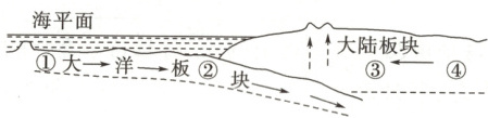 5.A 6.B [第5题,图示区域位于大洋板块与大陆板块的消亡边界,距离边界越近,岩石年龄越老,②③处岩石年龄较老,B、C错误。④位于大陆板块内部,距离板块张裂处(生长边界)较远,年龄较老,D错误。①位于大洋板块内部,距离大洋中脊较近,岩石年龄较新,A正确。第6题,图示板块边界为大洋板块与大陆板块碰撞挤压形成,在大陆板块形成海岸山脉,B正确。东非裂谷是张裂作用形成,A错误。大西洋是板块张裂的结果,C错误。喜马拉雅山脉位于大陆板块与大陆板块的交界处,D错误。]