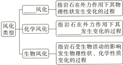 1.概念:地球表层的岩石在太阳辐射、_______、大气及_______的作用下,其物理、化学性质发生变化的过程。