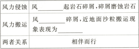 3.× 风力可以吹扬起岩石的碎屑,并挟带碎屑磨蚀岩石,这说明风力侵蚀是与风力搬运相伴而行的。