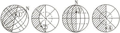 3.B 4.D [第3题,由于昏线是沿自转方向由昼半球进入夜半球的分界线,所以图中四点只有②点处在昏线上。第4题,晨昏线所在的平面始终与太阳光线垂直,所以图中四点所在的晨昏线平面与太阳光线都是垂直的。本题易错选的原因是忽略了晨昏线所在平面与太阳光线垂直这一特点。]