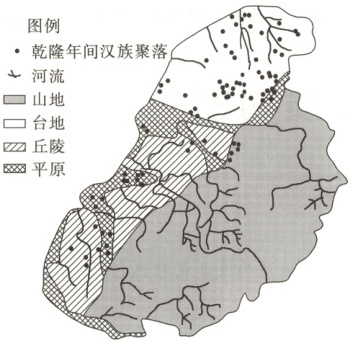 下图为某岛屿西北部乾隆年间汉族聚落分布图。读图,完成1~2题。
