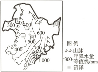 3.B 4.A [第3题,甲地区表示内蒙古高原的东部地区,草原广阔,适宜发展畜牧业;乙地区表示小兴安岭,山区适宜发展林业;丙地区表示松嫩平原,平原适宜发展种植业。故选B。第4题,丁地区位于三江平原,纬度高,热量不足,但地形平坦,土壤肥沃。①②正确。故选A。]