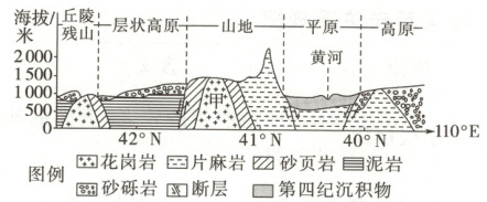 1.如图示意我国某地沿110°E经线地质剖面图。据此完成(1)~(2)题。