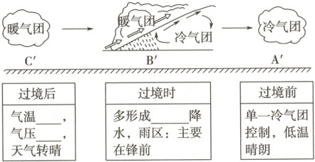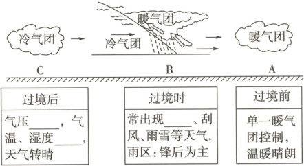 (2) 锋两侧的冷气团与暖气团在_______、湿度、_______等方面存在较大差异。