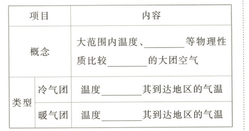 [名师点拨] 冷气团和暖气团都是相对概念,是和该气团到达地区的气温相比而言的;冷气团温度不一定低,暖气团温度不一定高。
