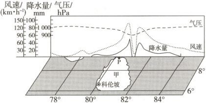 (2)题,图示天气系统中心气压低,降水很少,风力很小,应是飓风天气系统,是北半球强烈发展的热带气旋。]