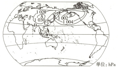 提示:北半球冬季。亚欧大陆形成势力强盛的冷高压,同纬度海洋上为低压。