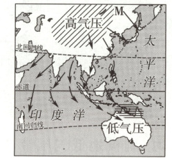 (1)题,亚欧大陆内部形成高压,故此时为1月。由图可知,M处风由大陆吹向海洋,为西北风,A正确。第