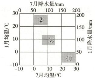 (1)题,通过图中信息可以得知,②气候类型1月均温为20~30℃,7月均温为0~10℃,根据“以温定带”可知,该地应该为亚热带;1月降水量为150~200mm,7月降水量为50~100mm,根据“以水定型”,夏季降水多,冬季降水少,所以为亚热带季风性湿润气候。第