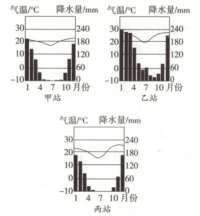 甲站、乙站、丙站是非洲大陆赤道附近的三个气象观测站,三个气象观测站所在地纬度大致相当,气候类型相同,但气温与降水量却存在一定差异。下图为甲站、乙站、丙站三个气象观测站的气候资料图。据此回答5~6题。