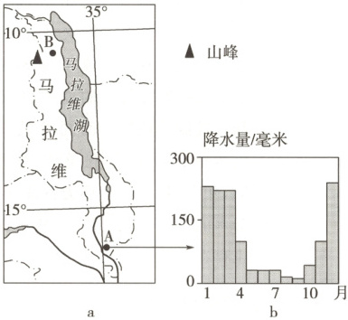 马拉维拥有独特的自然景观,该国气候受气压带和风带交替影响。图a为马拉维的地理位置示意图,图b为该国A地多年平均降水资料图。