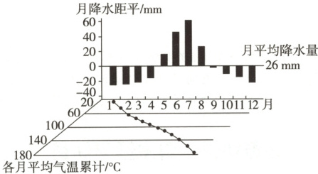 读世界某地区气候资料图(月平均降水量=年平均降水量/12,月降水距平=该月多年平均降水量-月平均降水量,本月平均气温累计=本月平均气温+上月平均气温累计),完成1~2题。