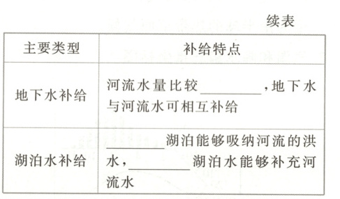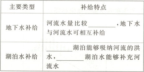 3. 教材第76页图4-1-6,该图展示了河流水与湖泊水的互补关系。由图可知,枯水期湖泊水补给河流水;洪水期河流水补给湖泊水。