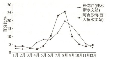 下图是阿克苏河(塔里木河支流)和松花江年内各月径流量比率图。