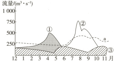 (1)题,读图可知,①补给最大量在4、5月份,是季节性积雪融水补给;②补给量最大且主要在夏季,是雨水补给,受降水量影响大;③补给量较稳定,是地下水补给;从补给量上看,地下水补给不是主要补给方式。第