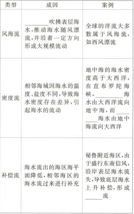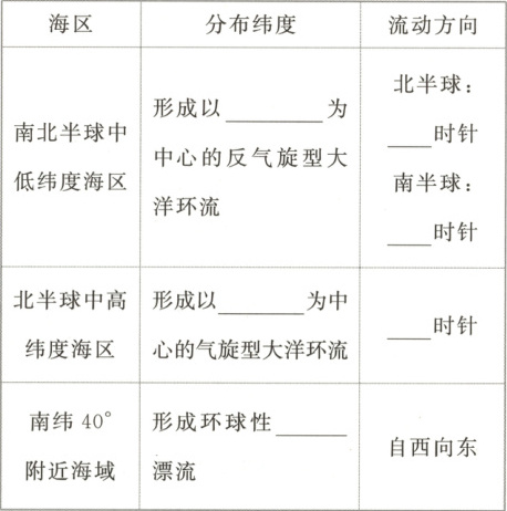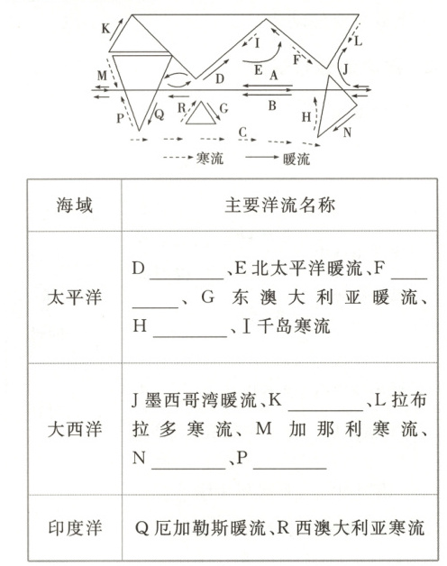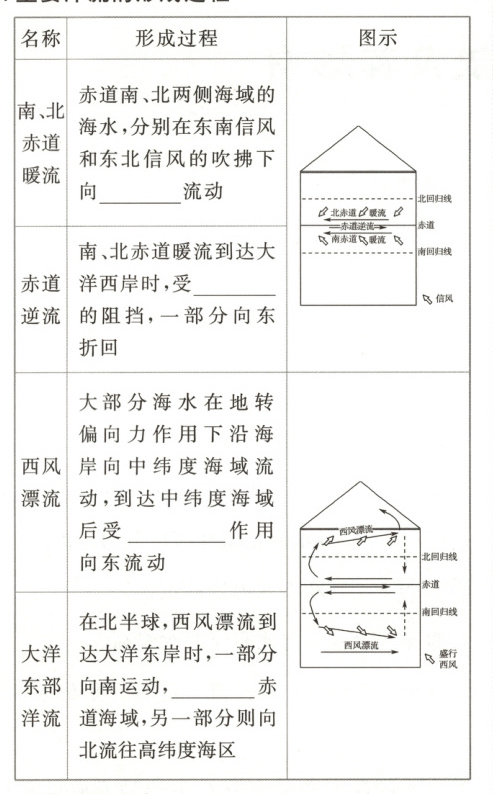 二、1.副热带 顺 逆 副极地 逆 西风 2.西 大陆轮廓 西风 补偿 3.日本暖流 加利福尼亚寒流 秘鲁寒流 北大西洋暖流 巴西暖流 本格拉寒流