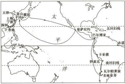 (1)题,曼萨尼约→釜山的航线先向南利用加利福尼亚寒流,然后向西利用北赤道暖流,最后向北利用日本暖流,因而在运输过程中比较节省动力;天津与香港之间,冬季海水自北向南流动,夏季海水自南向北流动;巴尔博亚→圣地亚哥为逆流航行;横滨→宁波的北段为逆流航行。第