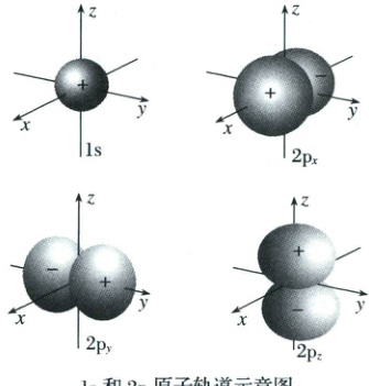 来表示,并可以将其以图形的方式在直角坐标系中呈现出来。如图给出了 1s 和 2p 原子轨道示意图。从图中可以看出,s 轨道在三维空间分布的图形为球形,即该原子轨道具有球对称性;p 轨道在三维空间分布的图形与 s 轨道明显不同,它的空间分布特点是分别相对于 $x、y、z$ 轴对称,也就是说,p 轨道在空间分别沿 $x、y、z$ 轴的方向分布。特别提醒 s 轨道为球形,p 轨道为“$\infty$”形,并不是说 s 轨道上的电子绕核做圆周运动,p 轨道上的电子绕核做“$\infty$”形运动。