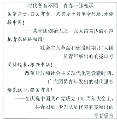 2. 一百年来,中国共青团始终与党同心、跟党奋斗,团结带领广大团员青年把忠诚书写在党和人民事业中,把青春播撒在民族复兴的征程上,把光荣镌刻在历史行进的史册里。