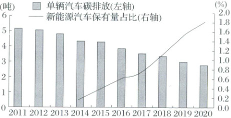 B 从图中信息可以看出,我国汽车产业单辆汽车碳排放量逐年下降,而新能源汽车保有量则增长迅速,说明我国汽车产业发展体现了绿色发展的理念和创新发展的理念,①③符合题意。绿色发展注重的是解决人与自然和谐共生问题,图示表明我国新能源汽车产业贯彻绿色发展理念,但看不出缓解了人与自然的矛盾,②与题意不符。我国汽车产业发展贯彻绿色发展和创新发展的理念,有利于改变生产生活方式,但图示看不出改变了人们的生产生活方式,④与题意不符。故本题选B。