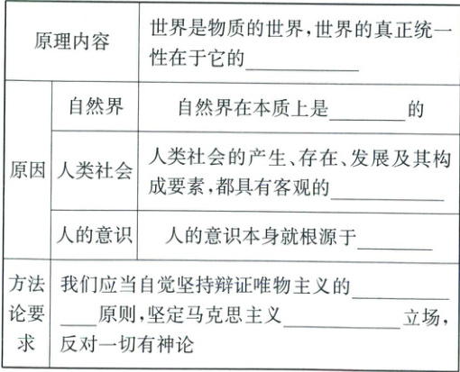 三、1.反应 刺激感应 意识 2.人脑 语言 3.物质器官 严密性 生理基础 4.客观存在 加工改造 5.物质性 物质 物质性 物质 物质统一性 无神论