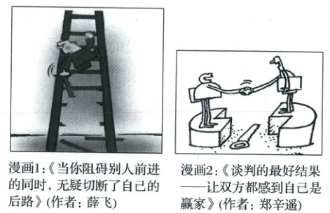 提示:漫画1说明损人不利己,矛盾双方既对立又统一,要用一分为二、全面的观点看问题。漫画2说明谈判双方存在利益分割,二者具有斗争性;同时,谈判双方的彼此的利益依赖于对方的利益,二者之间存在同一性,因此,谈判双方的利益关系是矛盾关系;矛盾双方利益的分割是在矛盾双方所结成的利益统一体中进行分割的,说明谈判双方的斗争性寓于同一性之中。