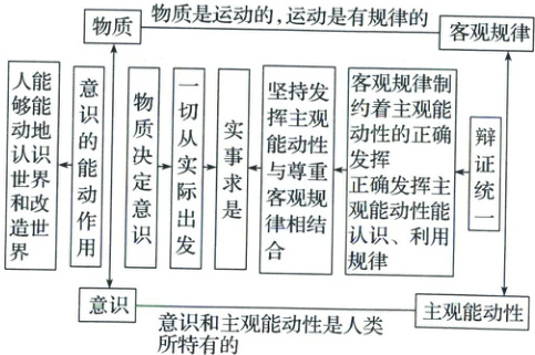 一般说来,辩证唯物论主要包括两个原理,一是物质和意识的辩证关系原理,二是客观规律与主观能动性的辩证关系原理。可结合下图来把握: