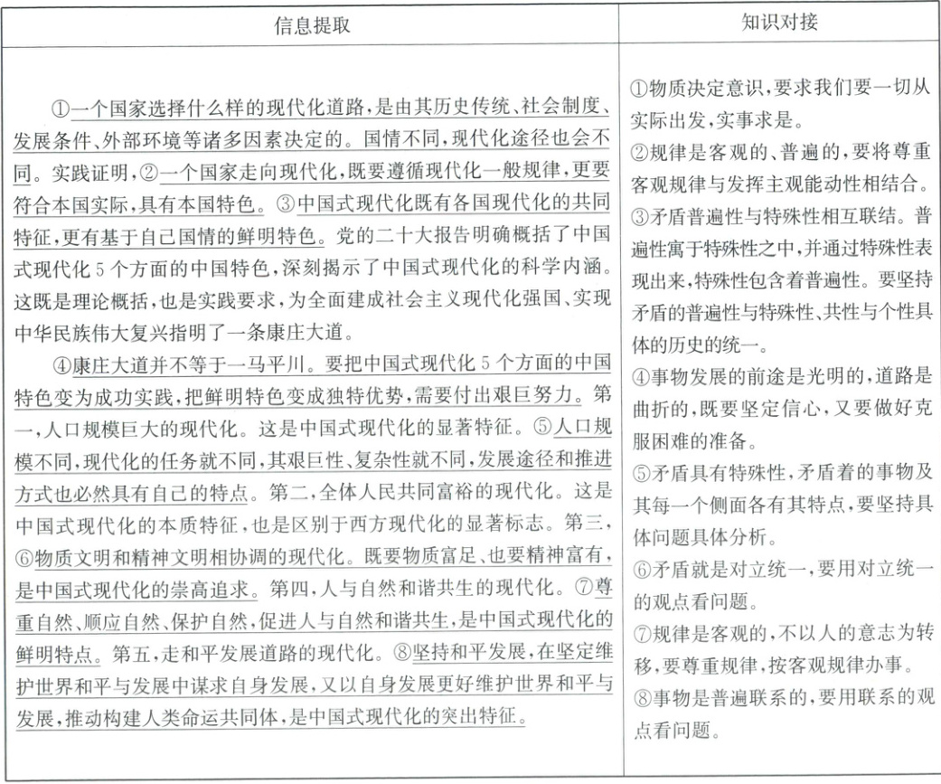 提示:①物质决定意识,要求一切从实际出发,实事求是。中国式现代化道路基于中国实际,具有鲜明的中国特色。②意识具有能动作用,正确意识指导实践,能够实现改造世界的预期目标。中国式现代化道路坚持马克思主义基本原理,发挥科学理论的指导作用。③规律是客观的,尊重客观规律是正确发挥主观能动性的前提条件。中国式现代化道路符合历史发展的客观规律,因此中国式现代化道路“走得对、走得通”。