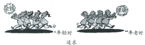 提示:漫画《追求》表明人们在年轻时追求金钱,到了年老时追求健康,表明社会意识的变化源于社会存在的变化,人们的价值观受时间、地点、条件的影响,价值判断和价值选择具有社会历史性。