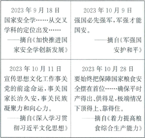 3.D “国家安全学……从交叉学科的定位出发”“宣传思想文化工作……事关国家长治久安”“军强才能国安”“粮食安全”,这些充分说明坚持总体国家安全观,必须综合考虑多方面安全,D正确。“国家安全利益是国家的最高利益”不能概括4篇文摘,不具有代表性,A不选。粮食安全、军事安全、文化安全各有其重要性,不能说粮食安全和军事安全比文化安全更重要,B不选。学习国家安全学应从交叉学科的定位出发,而不是优先学习农业和军事知识,C不选。