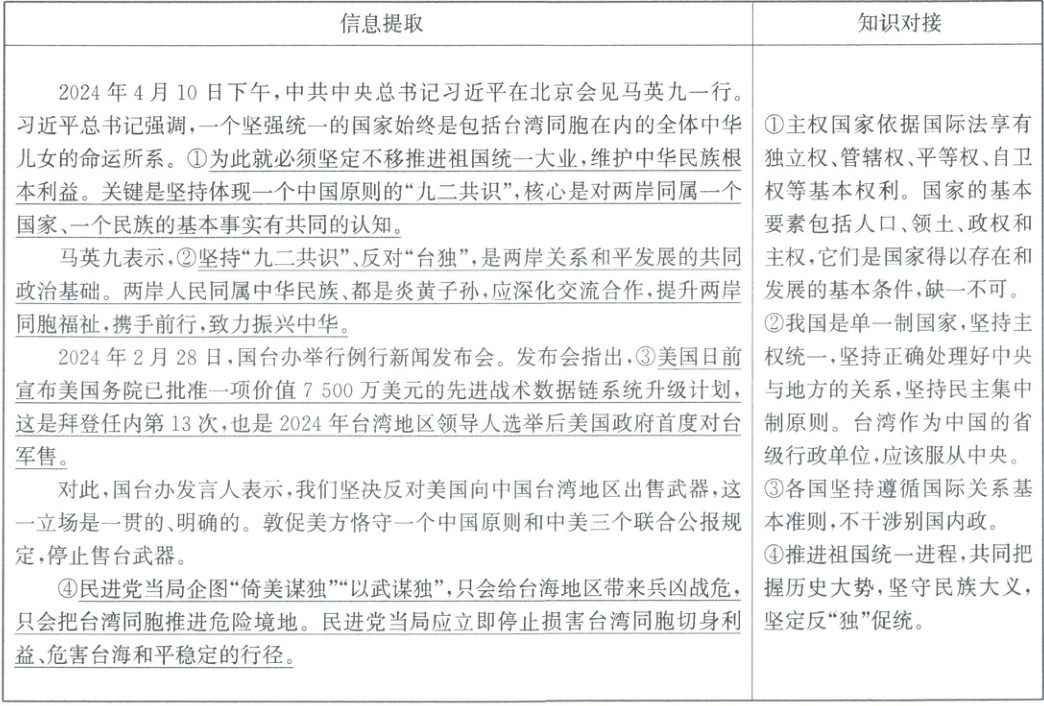 1.提示:①国家主权是现代国家得以存在的法理依据,它是统一的、不可分割的,是一个国家对其管辖区域所拥有的至高无上的、排他性的政治权利。宪法明确规定,台湾是中国的一部分,台湾问题是我国的主权问题。②国家安全利益是国家的最高利益,国家主权是国家安全的核心,领土安全是国家安全的重要内容。“台独”行为企图分裂国家,侵犯了中华民族整体利益。③我国实行单一制的国家结构形式。中央享有最高权力,地方政权被置于中央政权的统一领导下。台湾是我国的一个地方行政区域,必须接受中央的统一领导,坚决反对一切分裂中国的图谋和行径。