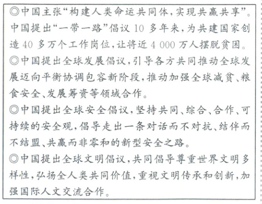 [对点训练 3] 构建人类命运共同体,建设一个持久和平、普遍安全、共同繁荣、开放包容、清洁美丽的世界,是中国提出的重要理念和重大倡议。构建人类命运共同体理念更是被写入联合国人权理事会决议,赢得了世界范围的认同。这表明 (