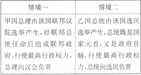 D 甲国总理由该国联邦议院选举产生,总理向议会负责,说明甲国政体是议会制;乙国总统由该国选民选举产生,总统既是国家元首,又是政府首脑,行使最高行政权力,总统向选民负责,说明乙国政体是总统制,①错误,③正确。由题意可知,甲国政体是议会制,乙国政体是总统制,甲乙两国的政权组织形式都是民主共和制,④正确。甲国总理由联邦总统任命,行使最高行政权力,表明甲国总理是最高行政长官,但不是本国的元首,②错误。故本题选D。
