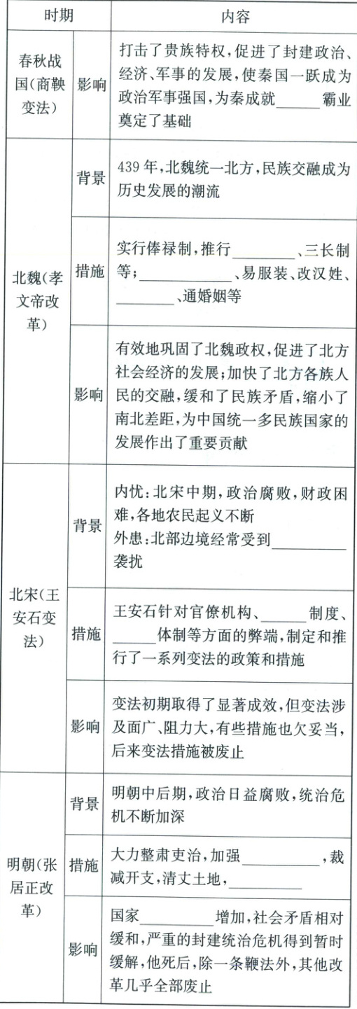 (3)王安石变法和张居正改革都是挽救统治危机,巩固封建统治,实现富国强兵的改革。