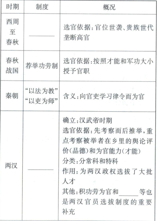 1. 西周至春秋:世官制;两汉:察举制;其他:征辟制;