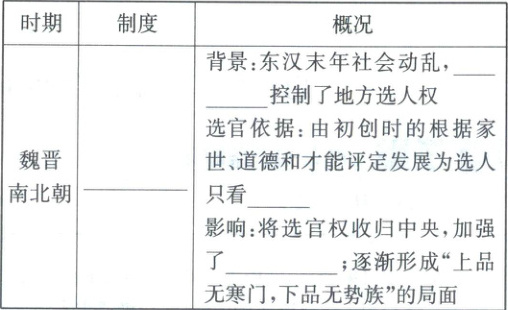 2. 魏晋南北朝:九品中正制;背景:豪强;选官依据:家世;影响:中央集权;