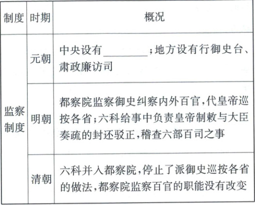 |监察制度|元朝|中央设有御史台;地方设有行御史台、肃政廉访司|