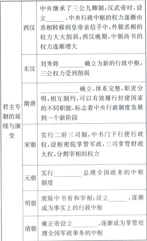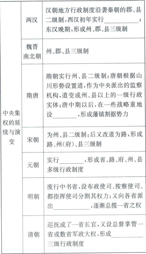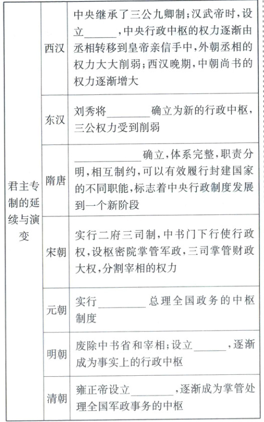 1.中朝 尚书台 三省六部制 中书省 内阁 军机处 2.郡国并行制 节度使 行省制 巡抚、巡按 省、府、县