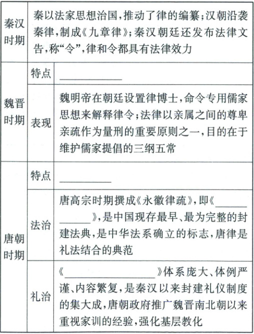 1.C 据材料可知,当时注重对百姓的教化同时也重视刑罚的运用,由此可知当时教化与刑罚相辅相成,故选C项;德治与法治之争最早出现在春秋时期,排除A项;援礼入法始于汉武帝尊崇儒术后,排除B项;材料“以乡三物教万民”“以乡八刑纠万民”仅反映当时教化与刑罚并重,不足以说明社会局面安定有序,排除D项。