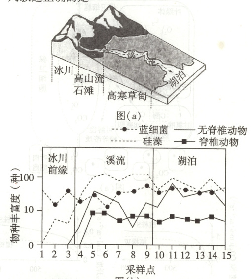 错误项分析:由图(b)可知,湖泊中有蓝细菌、硅藻、无脊椎动物和脊椎动物,蓝细菌和硅藻属于第一营养级,故湖泊中可能有三个营养级,A错误。群落的垂直结构指在垂直方向上,大多数群落都具有明显的分层现象,从高山流石滩到高寒草甸生物的分布体现了群落的水平结构,C错误。冰川融水会将溪流沿岸的无机盐和有机物残体等带入湖泊,有机物残体中的能量也属于输入湖泊生态系统的能量,D错误。