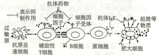一些病原体可以和B细胞接触,这为激活B细胞提供了第一个信号。辅助性T细胞表面的特定分子发生变化并与B细胞结合,这是激活B细胞的第二个信号,故B正确。引起过敏反应的抗原物质叫作过敏原,鱼、虾、牛奶、蛋类、花粉、花生等都是(或含有)过敏原。有些人在接触过敏原时,在过敏原的刺激下,B细胞会活化产生抗体。这些抗体吸附在某些细胞(如肥大细胞)的表面,这些细胞常分布在皮肤、呼吸道或消化道黏膜以及血液中。当相同的过敏原再次进入机体时,就会与吸附在细胞表面的相应抗体结合,使这些细胞释放出组胺等物质,引起毛细血管扩张、血管壁通透性增强、平滑肌收缩和腺体分泌增多,最终导致过敏者出现皮肤红肿、发疹、流涕、打喷嚏、哮喘、呼吸困难等症状,故C正确。分析题干和图示可知,该抗体药物能与特异性细胞因子受体结合,进而抑制细胞因子与细胞因子受体的结合,减少抗体IgE的产生,D正确。